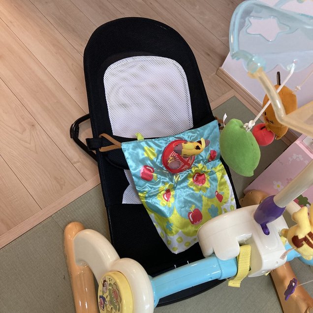 ちなみに、我が家には4年前に上の子のために購入したモンポケのメリーがありますが、そちらはバウンサーの前に固定しているので、「6WAYへんしんジム」は寝っ転がって使うおもちゃとして使用しています。このため、すでにメリーを持っている方でも、メリーを別の用途で固定して使っていれば、「6WAYへんしんジム」は活用できると思います。