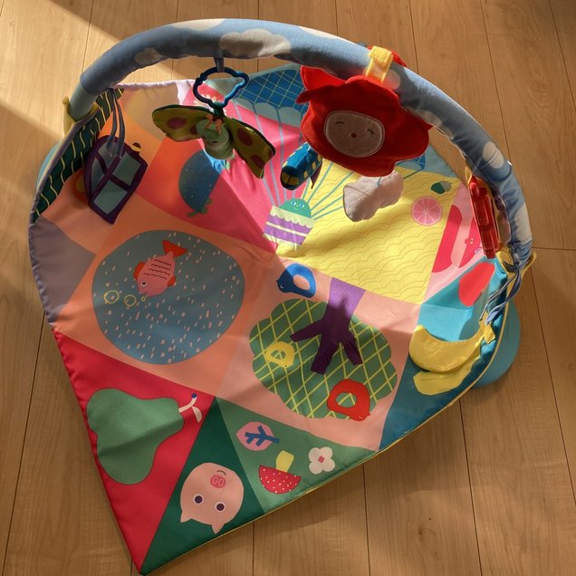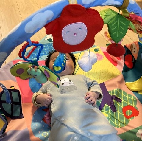 今まで、夜間以外は抱っこしていないと泣いていましたが、「6WAYへんしんジム」の上で機嫌の良い時なら5分程度1人遊びしてくれることがありました。