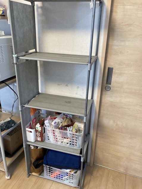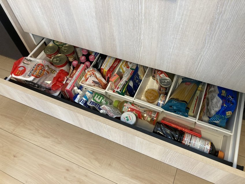 パスタやトマト缶、ペットボトルなどの常温の備蓄は、キッチン内の収納か、その横に棚を設けて足りています。