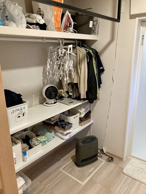脱衣所兼ランドリールームの一番の後悔は、季節家電用のコンセントをつけなかったことですね。夏は扇風機、冬はヒーターを使っていますが、電源をとるのに上の方から延長コードをつかっていてスマートじゃないです。