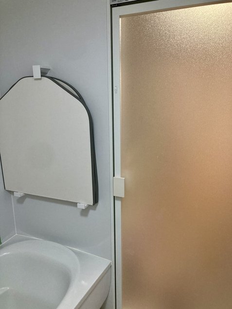 お風呂の扉は折れ戸ではなく引き戸にしたことで掃除がしやすいです。