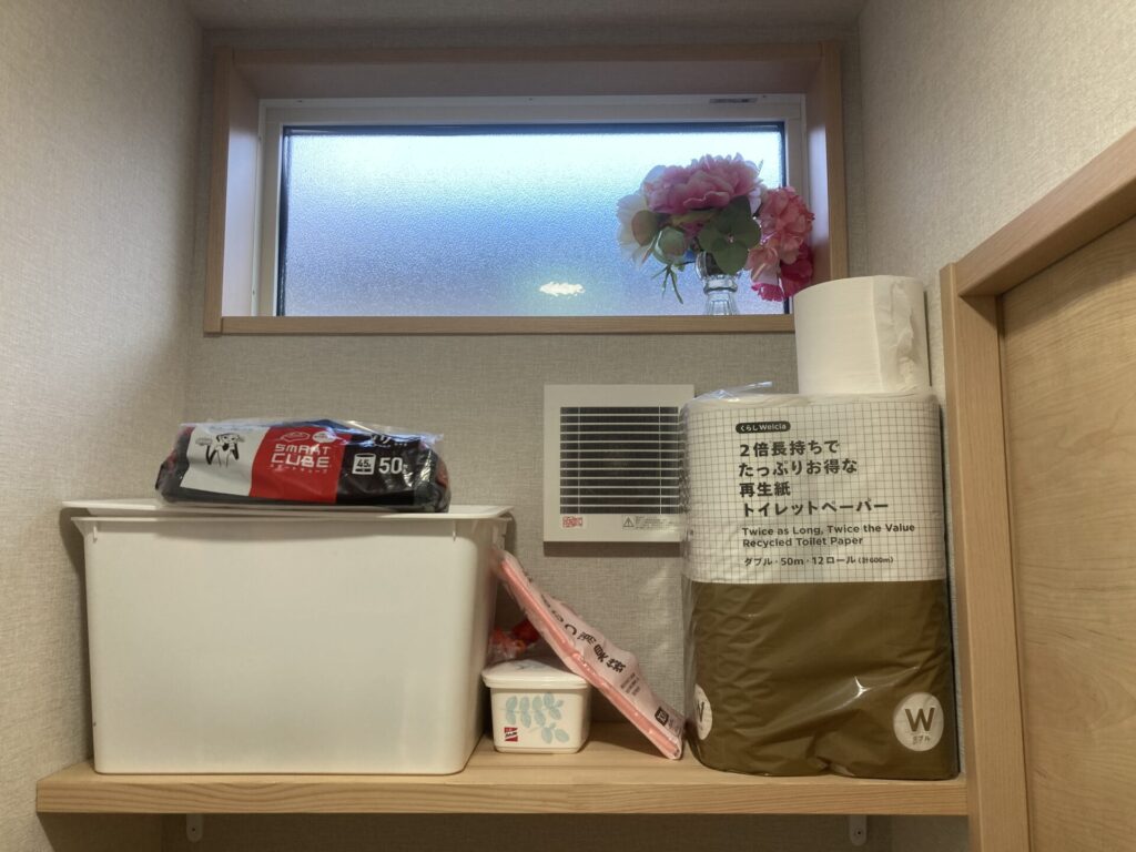収納するものは、トイレットペーパーや掃除用具くらいでしょうか。収納スペースは足りています。これ以上のストックを置くとなるとトイレの手前側の壁にも棚を作ることになると思いますが、今のところはいらないかな。スペースは余っているので収納が足りなくなったら検討です。